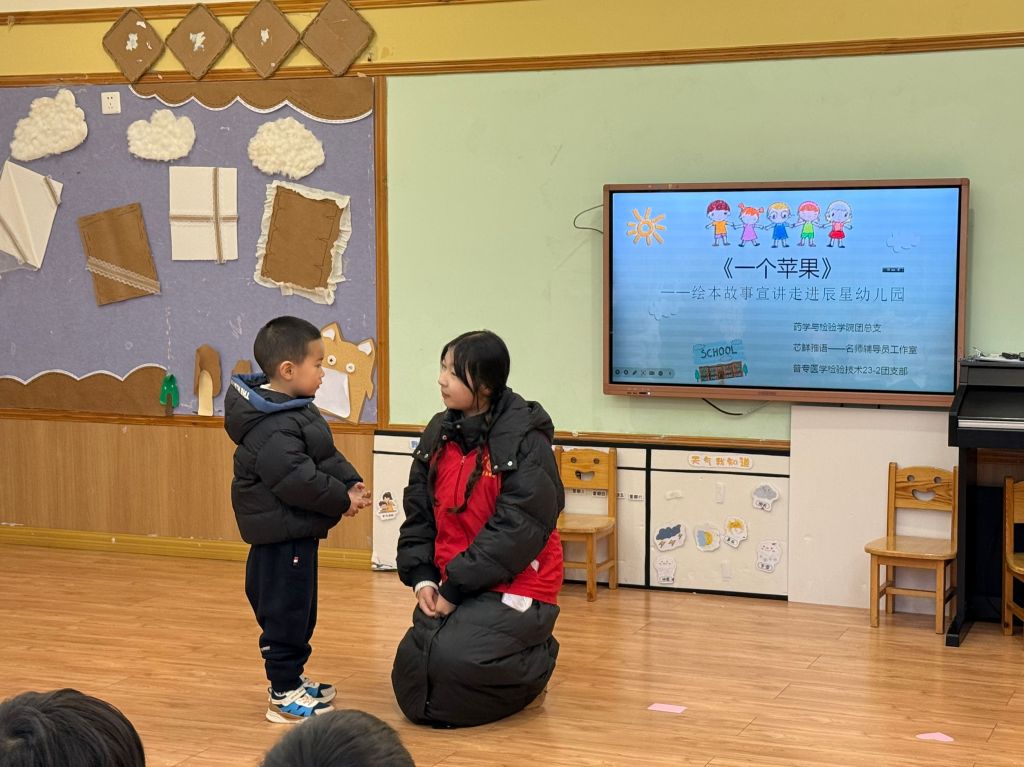 本次活动由太阳成集团tyc234cc团总支副书记曾晓梅带队。活动现场,各团支部成员满怀热情与耐心,为孩子们带来了一场精彩纷呈的绘本之旅。红色经典爱国主义绘本《一个苹果》、动物科普绘本《谁的尾巴掉了》绘本在同学们生动的讲述下,仿佛变成了一个个充满奇幻色彩的世界,牢牢吸引着孩子们的目光。