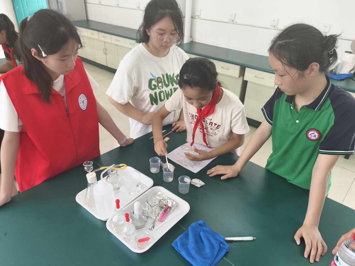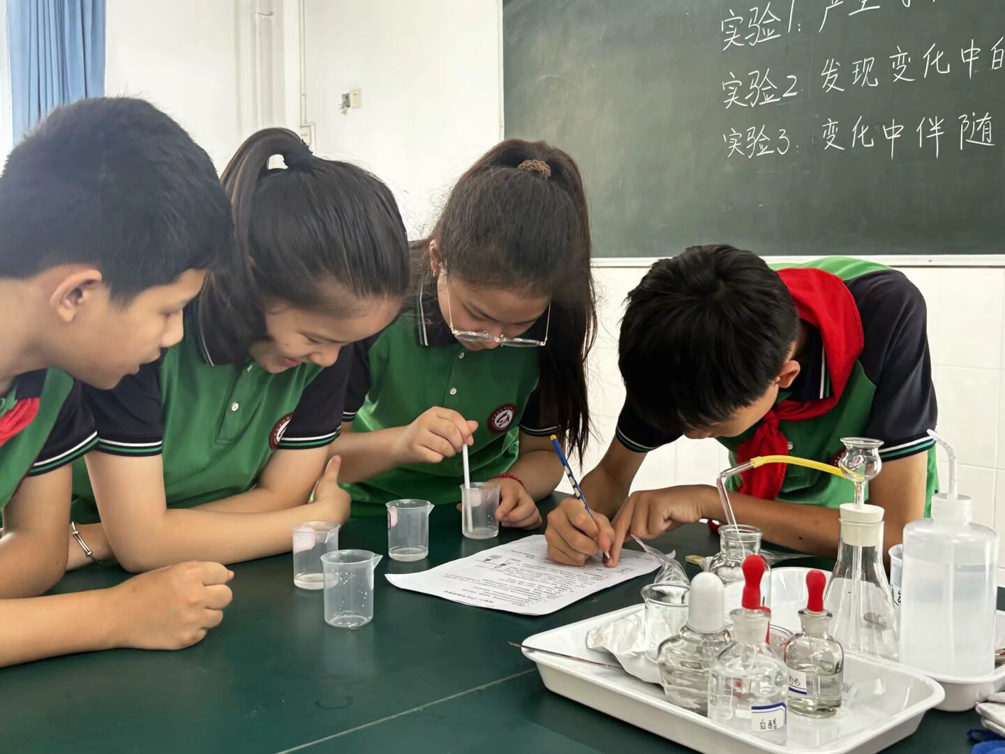本次科普活动紧跟小学六年级科学课教学进度及时开展“产生气体的变化”实验、“发现变化中的新物质”和“变化中伴随的现象”实验。物质的变化往往伴随着一些现象的发生,如变色、发光、发热、产生气体、产生沉淀、产生气味等现象。通过观察变化中伴随的现象,寻找证据来推理是否产生了新物质,进而判断是物理变化还是化学变化。