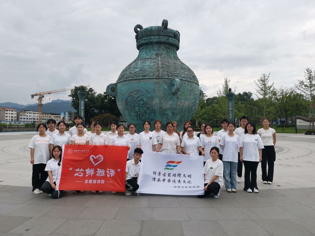 若水公园中央矗立着战国巴蜀镶嵌绿松石勾连凤鸟纹四钮青铜盖罍,是荥经博物馆“镇馆之宝”,展示了古蜀璀璨文明,凸显了荥经独特的精神文化坐标,是“千年严道、清雅荥经”的真实写照。宣讲团成员李明珂向大家详细讲解了青铜罍的出土年代和构造该等文物相关知识,该文物距今已有三千多年历史,为古蜀王国遗存。“罍”其实是一种大型盛酒器,作为礼器中的重器,“罍”象征着国家权力和高贵身份,同时也是贵族钟鸣鼎食的高雅点缀。
