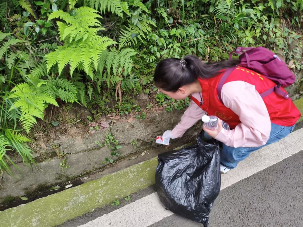 活动中,志愿者从天梯入口开始进行游走环保宣讲,通过垃圾分类宣传手册,向过往市民详细讲解可回收物、有害垃圾、厨余垃圾及其他垃圾的分类标准与处理方式,倡导“垃圾分类人人参与,美好环境家家受益”的环保理念。同时,志愿者分成3个小组,沿西蜀天梯台阶两侧展开地毯式清理:志愿者们右手带手套、左手拿垃圾袋,重点捡拾路面及绿化带内的烟头、食品包装袋;最后将收集的垃圾按类别投入对应垃圾桶,并向沿途居民演示正确的垃圾分类方法。过程中,志愿者们不怕脏、不怕累,分工明确、配合默契,红色的志愿服与干净的天梯环境形成鲜明对比。